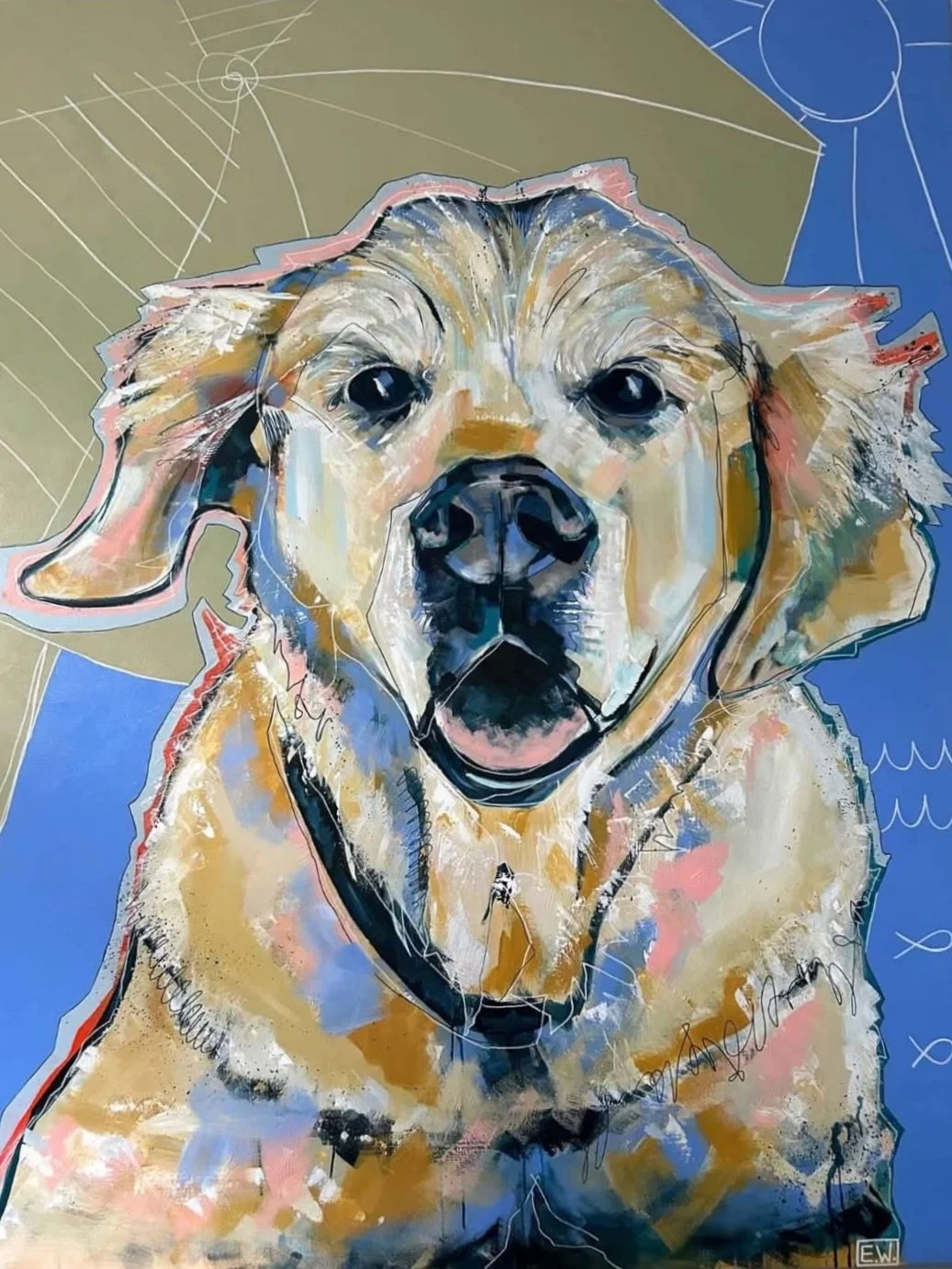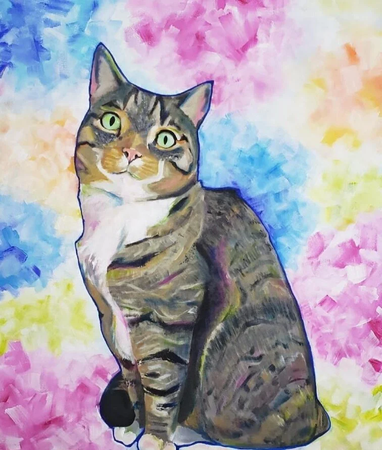 I love both pet and people portraits! Working with clients to create the perfect addition to your home, or a heartfelt one of a kind gift, is my absolute JAM. I love it. No idea is too crazy, I’ve done Batman and Die Hard themed pet portraits, and more simplified true to life reproductions.